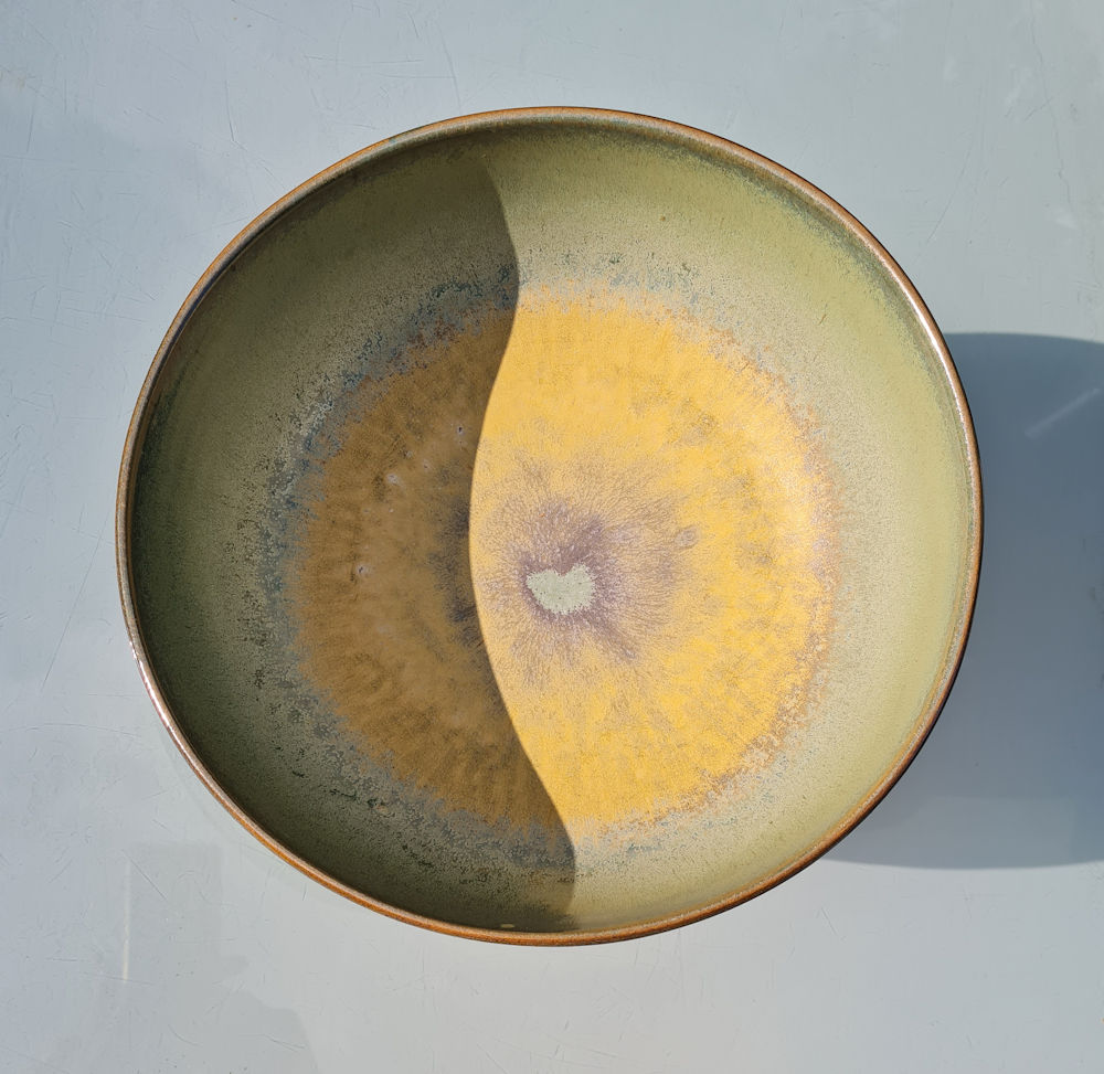 The glaze on the inside is turquoise, which is a very badly behaved glaze and runs down towards the centre.