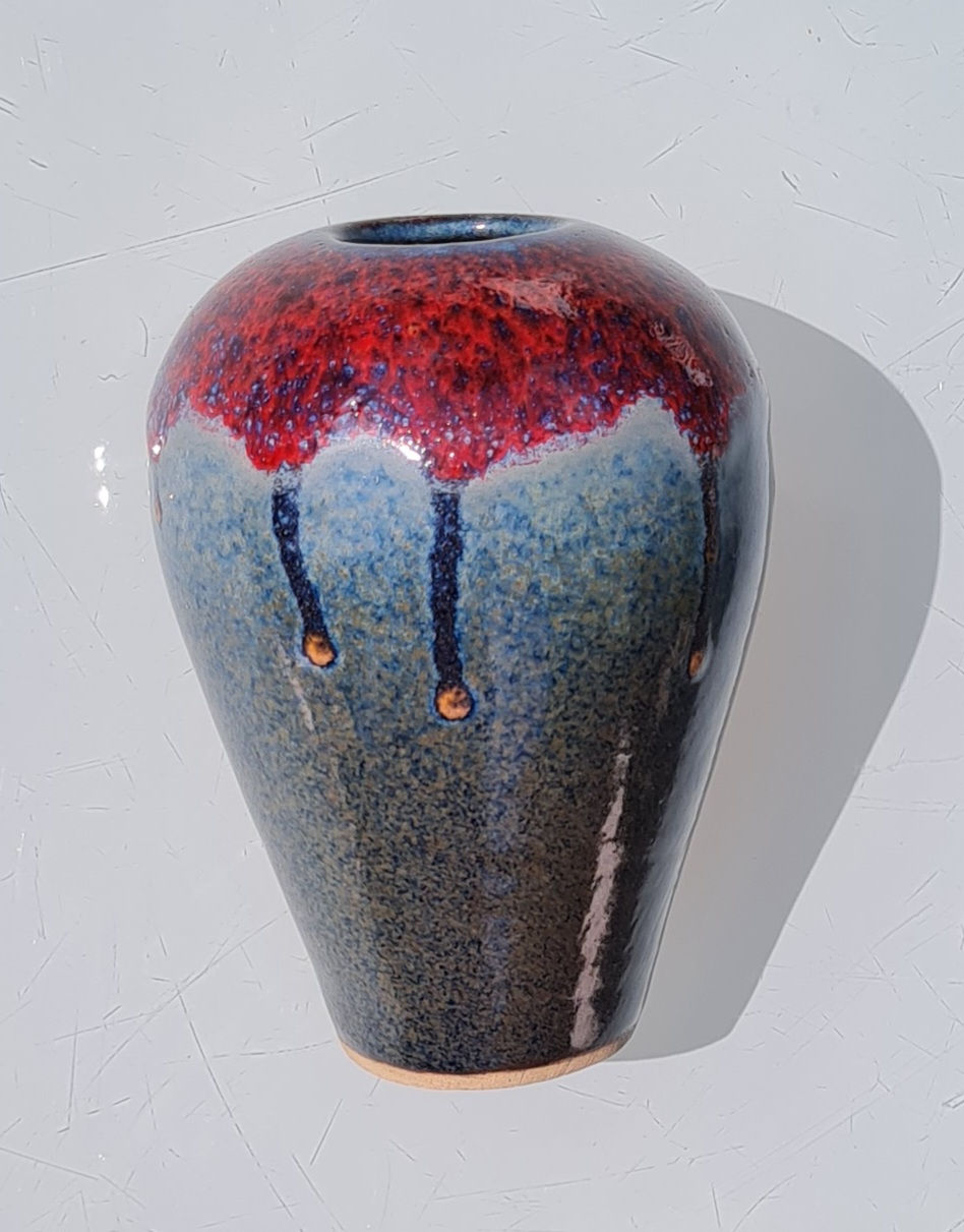 Diffuser vase Stoneware diffuser, Lava red and orange drips over Snowflake blue