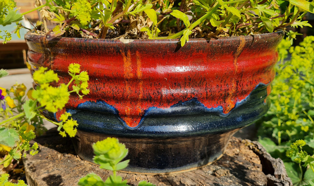 Large planter Stoneware planter with lava red and orange running into MG25. Splendid fringe. Big pot with