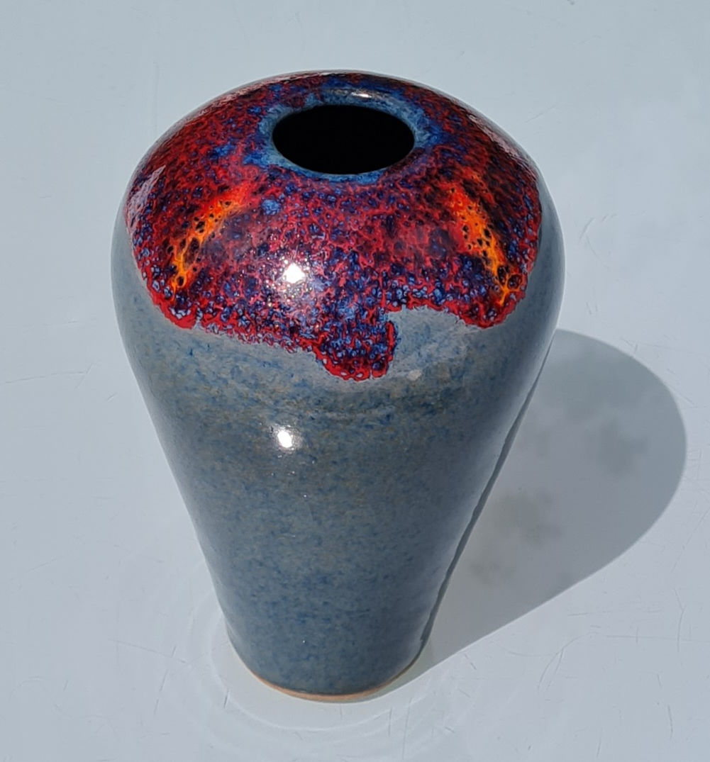 Diffuser vase Stoneware diffuser, Lava red and orange drips over Snowflake blue